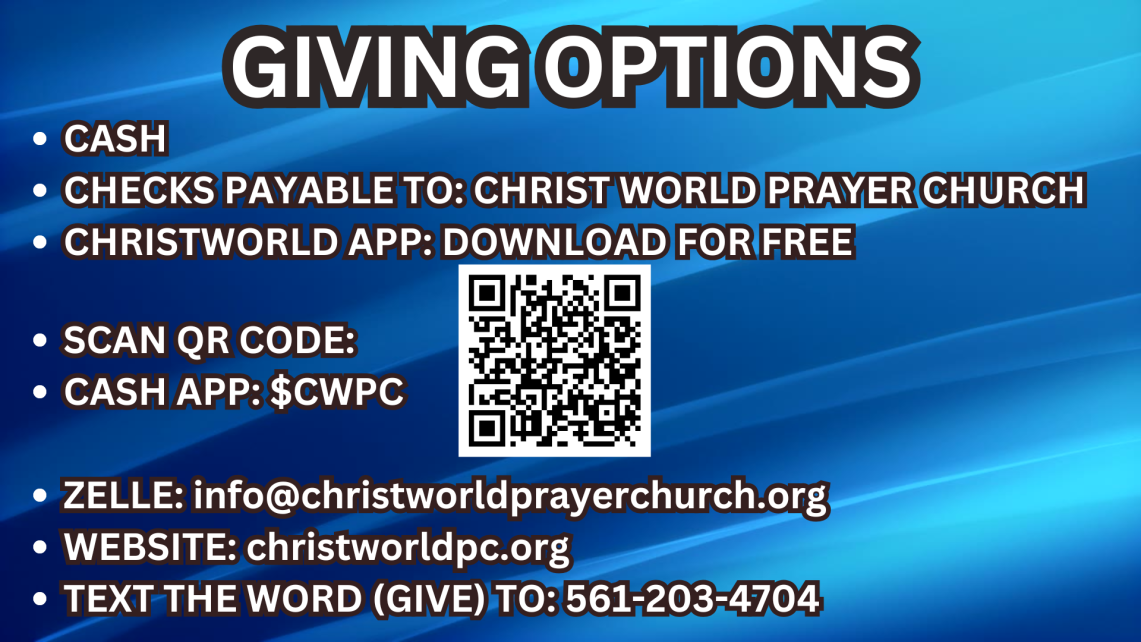 Therefore, we invite you to invest and store up treasures in your heavenly bank account by supporting the vision of Christ World Prayer Church. Blessings