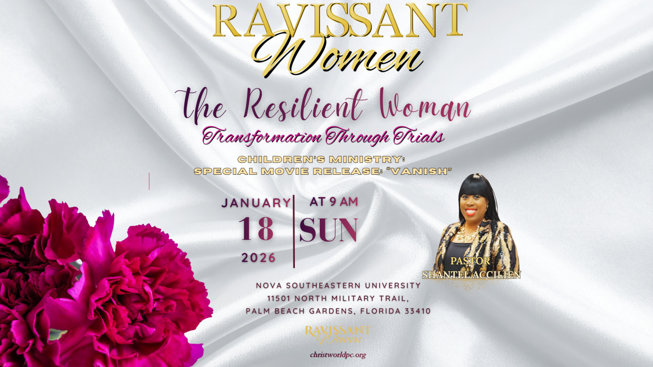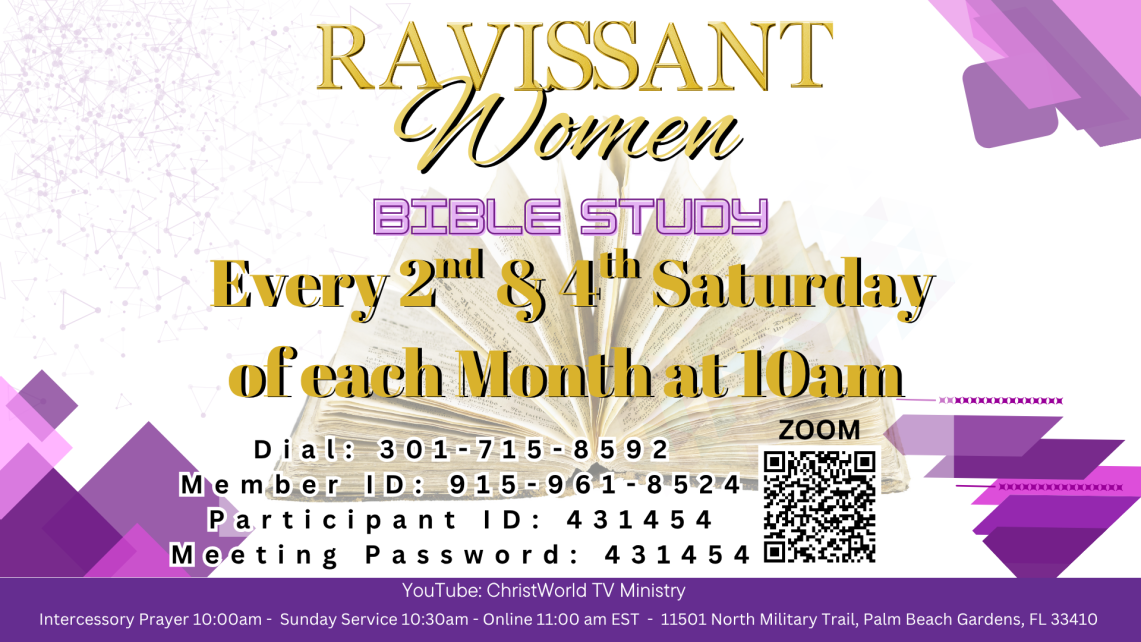 Ravissant Women's Day Service is every 3rd Sunday of each month at 9am. Ravissant Bible Study is on Zoom every 2nd and 4th Saturday of each month at 10am. Ravissant Women also hold an annual conference.