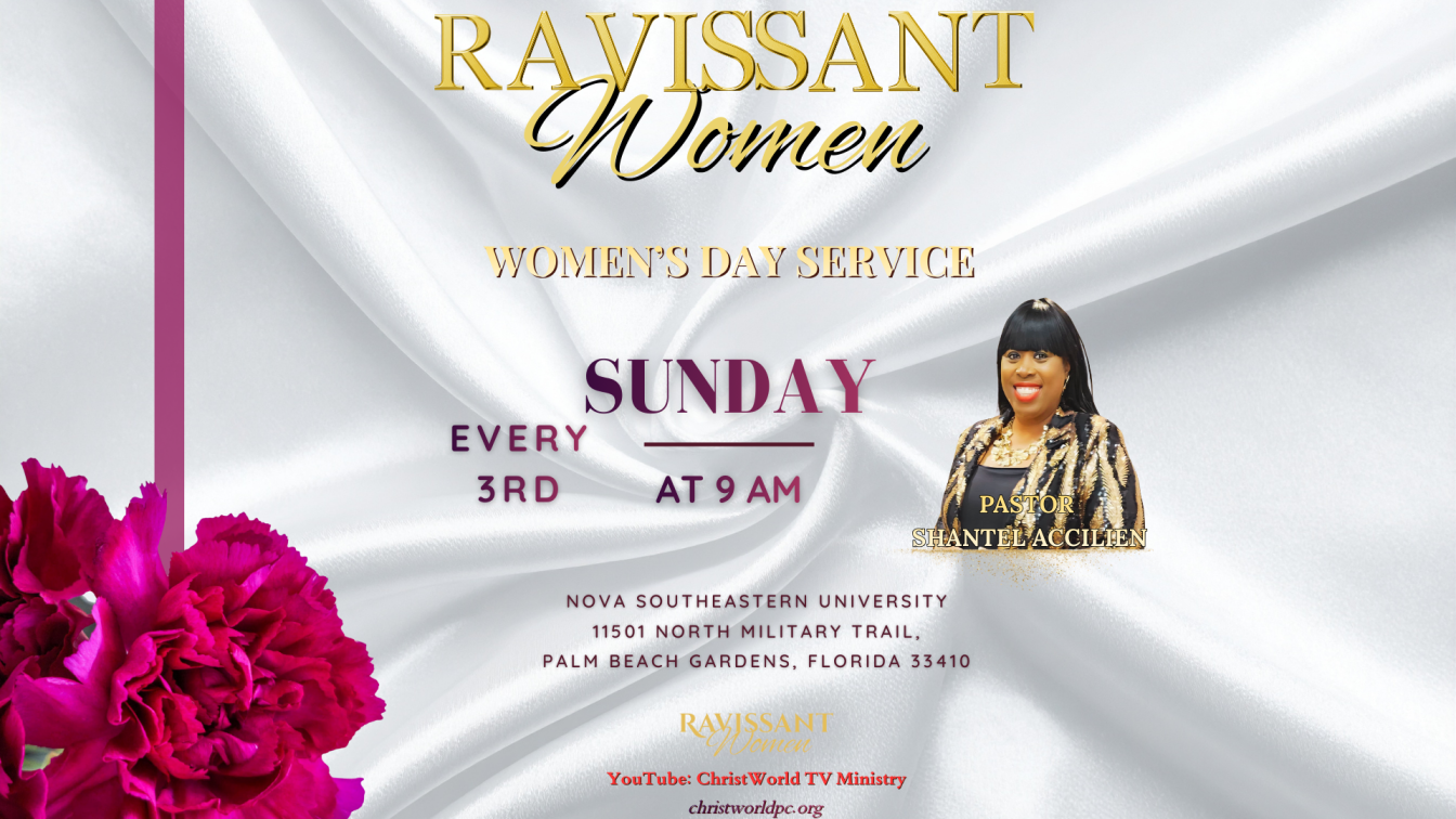 Ravissant Women's Day Service is every 3rd Sunday of each month at 9am. Ravissant Bible Study is on Zoom every 2nd and 4th Saturday of each month at 10am. Ravissant Women also hold an annual conference.